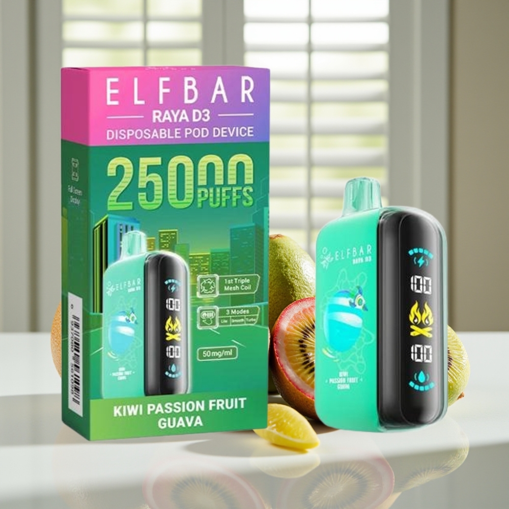 ELF BAR RAYA D3 25000 Puffs Engangs Vape Kiwi Passionsfrugt Guava – 23ml, 5% nikotin, Type-C opladning